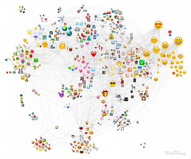 MailChimp 在文章中还提到,有近 31% 的营销邮件活动使用了不止一个 emoji 表情。于是它们利用数据分析生成了一张有趣的信息图,用于标识最常关联使用的 emoji 表情。