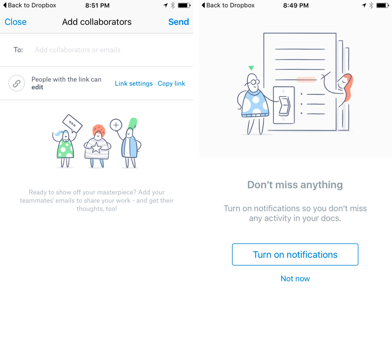 Emoji 是表达情感的一种方式但并不是唯一手段。目前的主流产品中我最喜欢的是 Dropbox,它用插画的形式很好地降低了用户阅读信息的枯燥,也更好地引导用户进行操作。