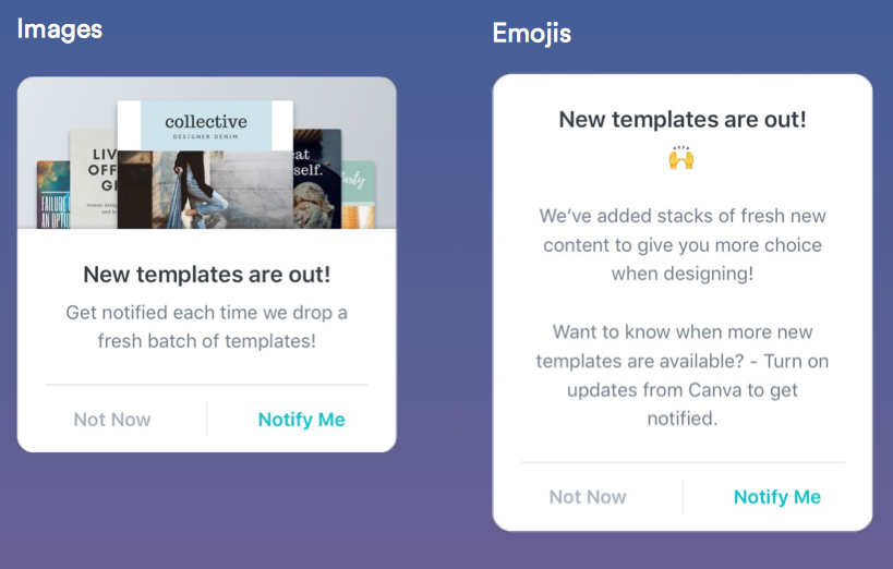 下图是设计工具 Canva 对于请求授权窗口 CTA 设计的两个版本,根据官方给出的测试数据,使用 emoji 的设计版本比图片的版本在点击转化率上高出 9%。